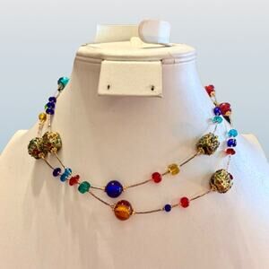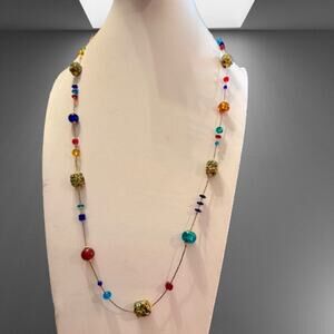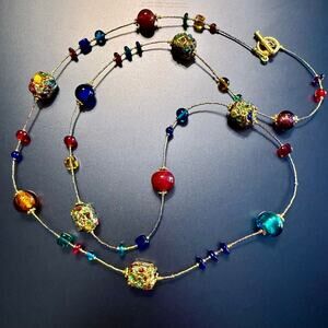 This is an exquisite colorful Murano glass beaded necklace with toggle closure. It measures 33.5" in total length so that it can be worn as one long strand or as a double layer. It's in excellent preloved condition, like new. It lacks the Murano stamp but based on my knowledge of such glass, I am confident it uses such beads.