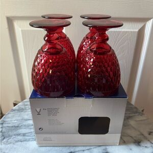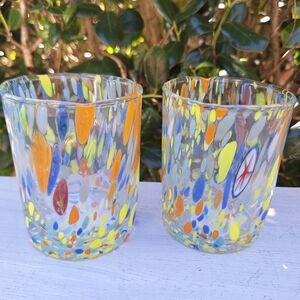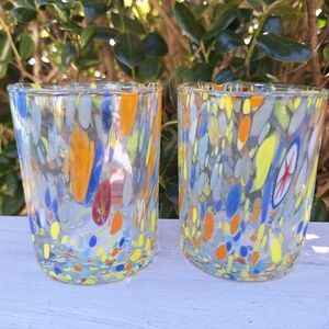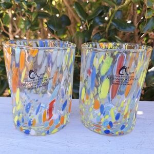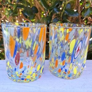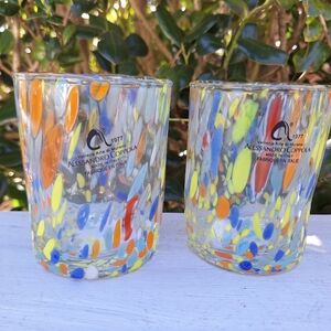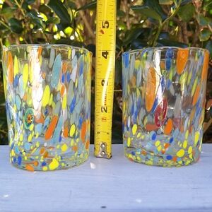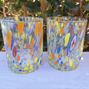 Murano Glass Cups Millefiori Tumblers Drinking Glasses Gift Set 2 Made in Italy Gorgeous italian hand blown glassware with swirls, dots, streaks and stripes of pastel yellow glass with orange red and light blue teal on clear glass with a few pieces of multi colored millefiori melted within. Beautiful! Color looks like a pastel or lighter color tones. THESE ARE NEW! Comes with a gift box. Made by italian artist family and have stickers on them. These are 3-3 1/2 inches wide x 4 inch tall.