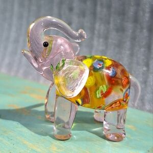 Murano Glass Elephant with Millefiore Multi Colored Blown Glass Handmade Small Animal Figurine Elephant with Trunk up and glass tail gorgeous glass art many colors in main part of body made from melted millefiori glass pieces and mostly clear pink glass with visible eyes. Gorgeous! Wonderful gift idea gift for her for daughter sister neice or treat yourself. Seller will gift wrap if you ask and remind me. Main Color of clear glass is a light pink with multi cokored center section.