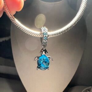 The Murano Glass Sea Turtle Dangle Charm is inspired by the peaceful creatures of the deep blue sea. The sea turtle charm features bleached aqua blue crystals, icy green crystals and a single peacock Murano glass bead. The sterling silver cut-out pattern on the belly of the turtle features a heart and shines through the Murano glass to create a beautiful scale-like effect that dances with the light.