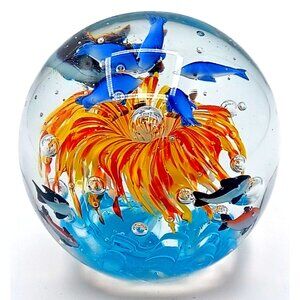 Dive into the enchanting underwater world with this vintage Murano glass paperweight. Every detail, from the swirling aquatic hues to the vibrant fish, evokes the beauty of tropical seas. A handcrafted masterpiece, it captures the essence of marine life, making it a timeless treasure for collectors and admirers alike.