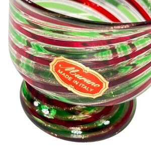This Murano glass votive candle holder showcases exquisite craftsmanship with its vibrant red and green swirls accented by shimmering gold. A timeless addition to any decor.
