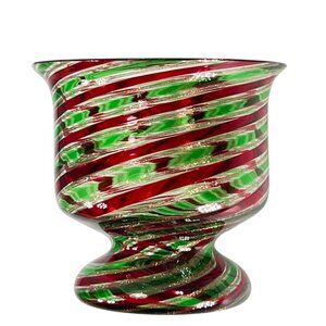 Murano Glass Votive Candle Holder Red Green Gold Swirl Footed Handcrafted 3 inch