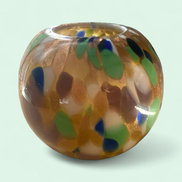 This Hand Blown Murano Art Glass Vase is a stunning example of Italian craftsmanship and color artistry. 🌟 With golden cased glass that shimmers in the light and rich swirls of green, cobalt blue, and white, this round globe-shaped vase adds instant elegance to any room.