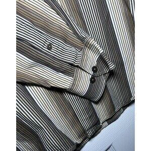 The product is a Murano men's button-up shirt in size XL, featuring a modern comfort design. It is striped in brown and made of cotton and Lastol material. The shirt has long sleeves, a button closure, and comes with button accents. It is machine washable and is a regular fit for men.