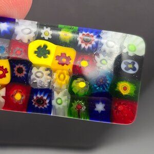 This vintage Murano-style Millefiori glass pendant is a miniature canvas of color and craftsmanship. Measuring 1.75" tall with the bail and 0.75" wide, it showcases a rectangular slab of Millefiori glass packed with floral and geometric canes in vivid hues—reds, yellows, blues, greens, and whites—all arranged in a mesmerizing mosaic.
