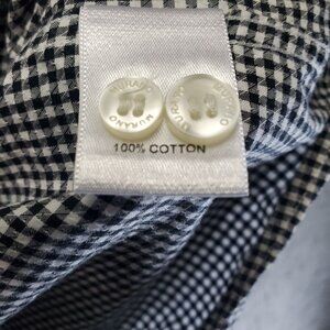 100% cotton black and white checkered shirt with long sleeves, button-up front, and collared neckline. Made in El Salvador. Approx. measurements: Machine washable.