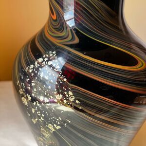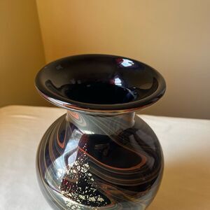 Murano Style Art Glass Vase Hand Blown Black with Gold Foil Mid Century Modern