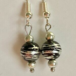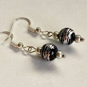 Murano Style Black Silver Art Glass Bead Earrings Plated Dainty Dangle Handmade