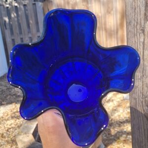 Stunning blue glass vase with a wavy rim. Perfect for home decor
