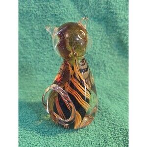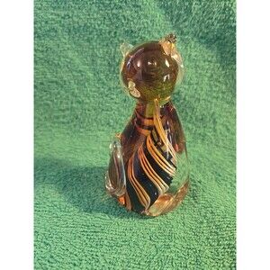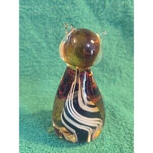 Murano Style Glass Cat Paperweight Amber w/ Blue White Swirl