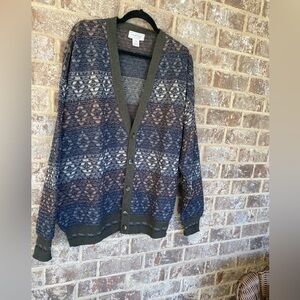 Murano vintage grandpa button down cardigan. 70% acrylic 30% wool. Machine washable cold cold. Armpit to armpit measures 27”. Shoulder to hemline 29”. Sleeve length 22”. No flaws seen. See pictures bicep 10”. Shoulder to shoulder 29”.