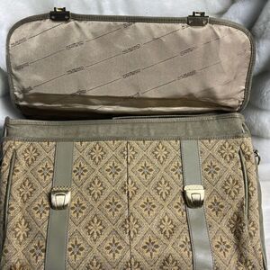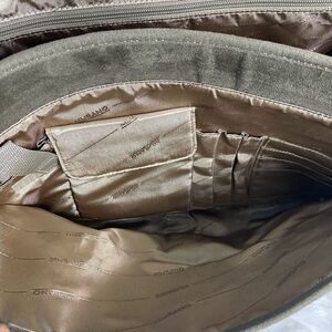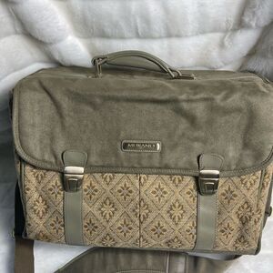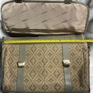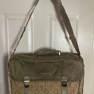 Murano travel weekender bag olive green polyester and beige gold tone hardwares detachable shoulder strap ,flap snap closure front compartment with pockets for pens ,cellphone main compartment with side zipper ,back compartment. Pre owned in good used condition normal wear see all pictures any questions please message