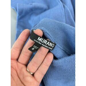 Murano brand women's size small light blue mock neck lightweight sweater. In good pre-owned condition, has one tiny spot near hemline. Soft lightweight extra fine merino wool has a great stretch.