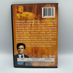 This DVD features the classic 1975 mystery-thriller *Murder on Flight 502*. Starring Farrah Fawcett, Sonny Bono, and Robert Stack, it follows a suspenseful journey on a flight from New York to London. This full-frame edition offers 98 minutes of intrigue and is presented in English with stereo sound.
