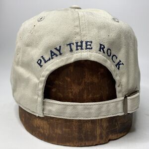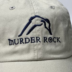 A Murder Rock golf hat, beige with navy blue embroidery. Adjustable strapback with "Play the Rock" embroidered on back and "Murder Rock" plus logo on front. Made by American Needle Quality Headwear. Item is in new condition with price sticker attached on underside of brim. Please see photos for complete description.
