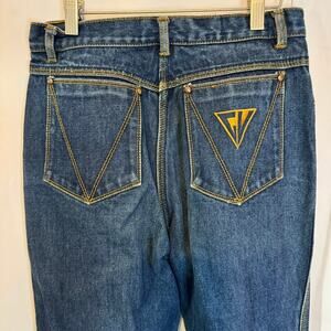 Authentic vintage Murjani women's jeans, made in Hong Kong from 100% cotton. These classic high-rise jeans feature a tapered leg, iconic yellow triangle back pocket embroidery, and heavy-duty stitching throughout. Tagged size 13 with a timeless indigo wash designed to fade naturally over time.