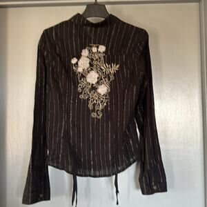 Front button closure. Lace up side front. Long sleeves have button cuffs. Lightweight cotton with metallic thread stripes. Large floral embroidery on back.