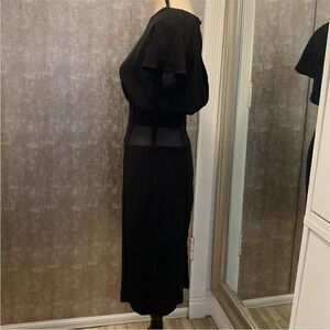 This chic black midi dress features a flowy silhouette that gracefully drapes over the body, offering both comfort and style. The V-neckline adds a touch of elegance, making it perfect for both casual outings and more formal occasions. Its timeless design ensures it remains a staple in your wardrobe for years to come. New, no tags