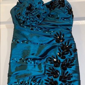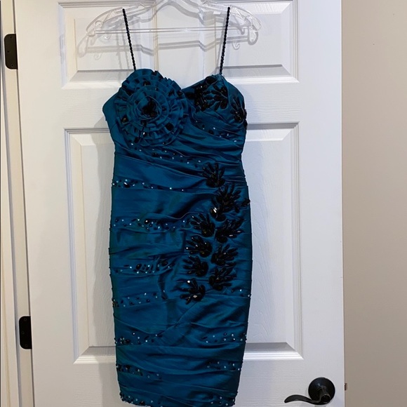 evening dress that is beaded throughout. Used once, in good condition, might have a few loose beads but an easy fix. Does have a few loose strings they are also a very easy fix. This dress is extremely gorgeous, the color and material is beautiful. Tag ripped off because it was a little itchy. Nice elegant formfitting, I do not see any stains, if there are any obviously they are not significant but I do not see any. message me if you have any questions. Feel free to bundle with other items for a better pricing.