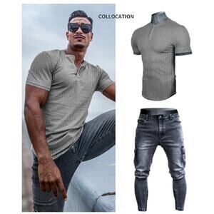 98%Cotton.Double knit, ribbed knit surface. 】It is not a heavy weight fabric, so it is suitable for year-round wear. Can be worn on its own or as a base layer. Short sleeves 230±g. This is a T-shirt suitable for spring, summer, autumn and winter. Whether used as a base layer or worn alone, you will not be disappointed.【Material】Fabric woven with four-way stretch that provides comfortable movement, elasticity, and maximum recovery. It is normal for ribbed elastic fabrics to shrink after washing.【Style】Front placket 3 buttons closure design, stylish style. Slim fit, no back collar label, will not cause discomfort to the neck. Premium fabric elevated by subtle stripes makes our exclusive sweaters luxuriously soft, warm, lightweight, and breathable.【Occasion】 Suitable for casual, dating, outdoor activity, workout, party or other semi-formal occasion. Can be worn on any occasion, as long as you like.