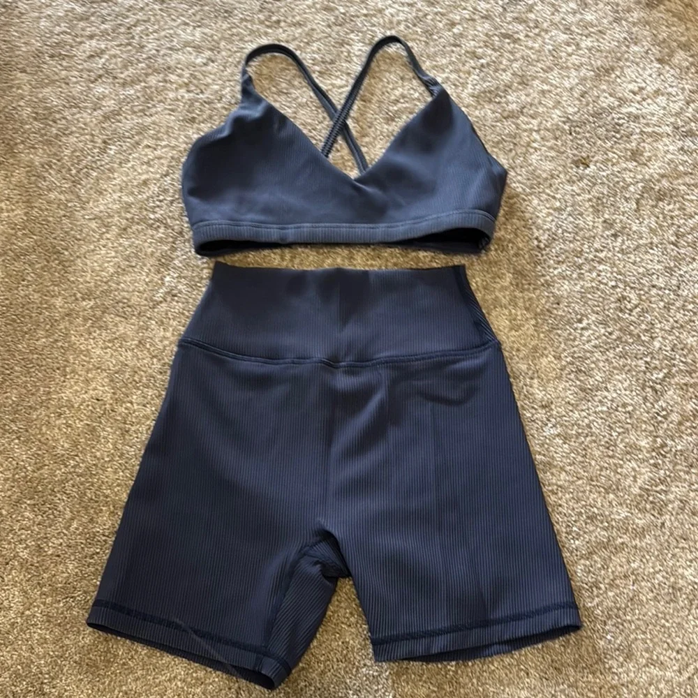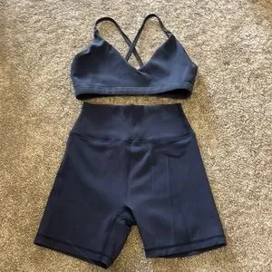 Stylish distressed navy ribbed sports bra and shorts set. Perfect for workouts or casual wear. Size small.