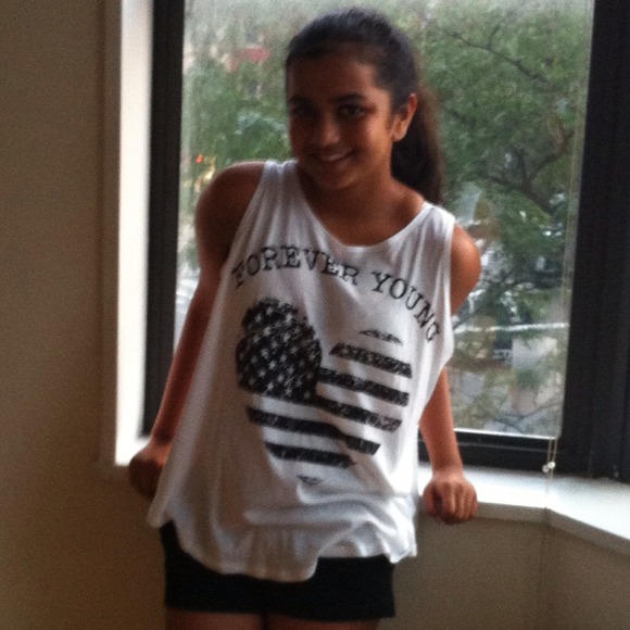 Muscle tank with a heart shaped American flag and it says forever young above it. It has a round glory style. Very comfortable and soft from Charlotte Russe.