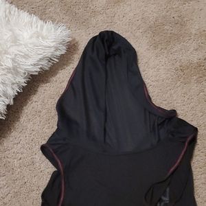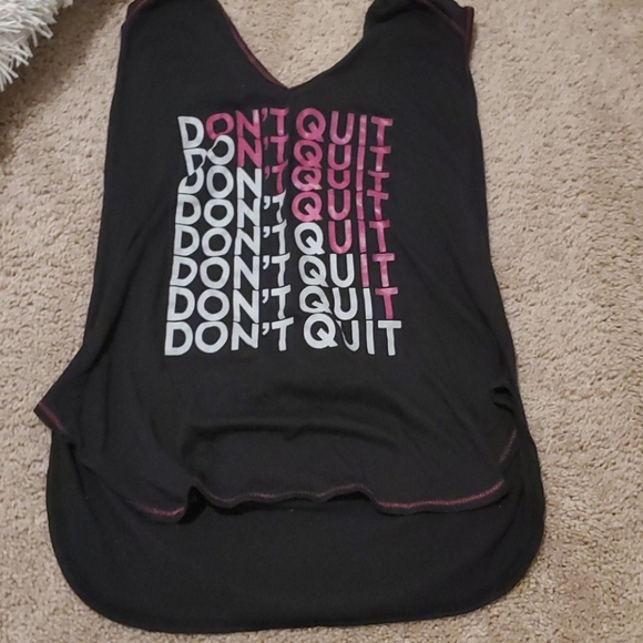 V-neck muscle tank top with a hoodie and white and pink words ( DON'TQUIT).