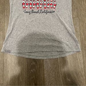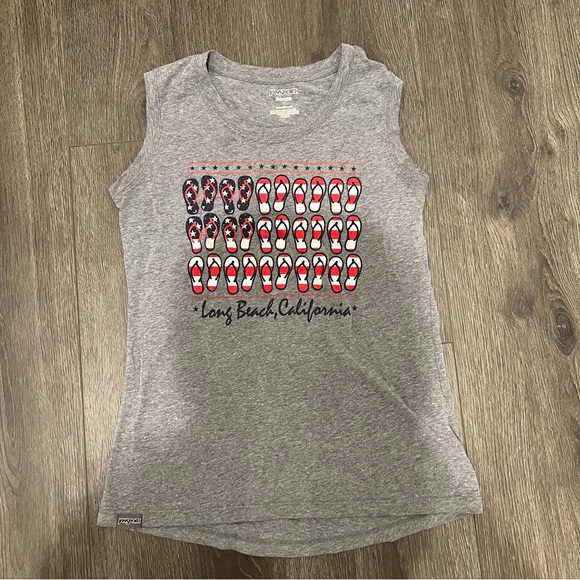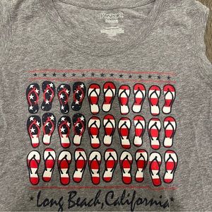 Jansport muscle tee. American flag flip-flop design on front, Long Beach California. Relaxed fit size small. Gray. Very soft and stretchy. 50%, cotton 50% polyester. Slightly longer in back. Length 23 1/2 inches. Width at smallest point 15 1/2 inches. Great condition. Smoke and pet free home. Excepting offers. Bundle and save!