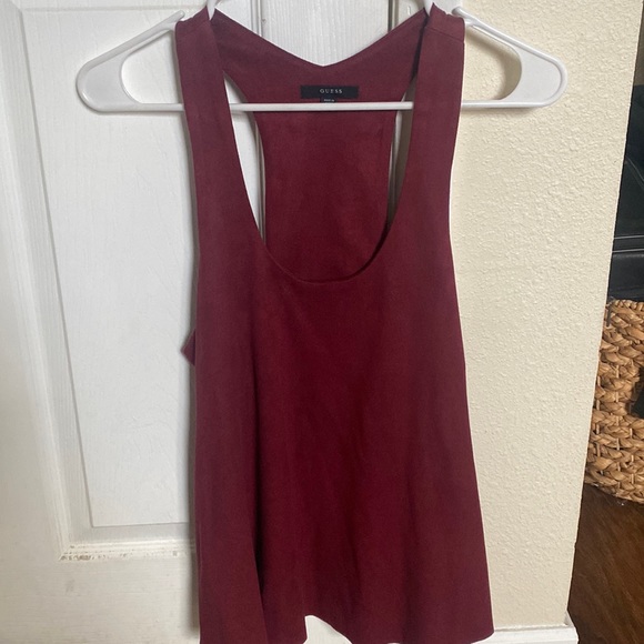 This is a dress up muscle tank Maroon color Material is suede like- has special washing instructions This is such a cute and sexy top Like new condition