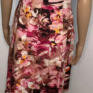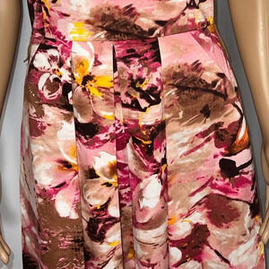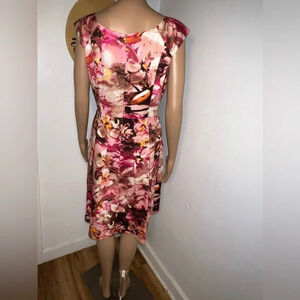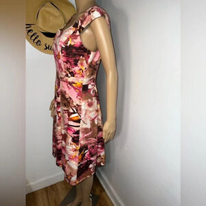 Muse, 10, scoop neck, pleated,darted frame, pocketed,soft sweetheart neckline, caplets sleeve, midi dress, rear zip hook & eye closure, has belt loops, no belt present.