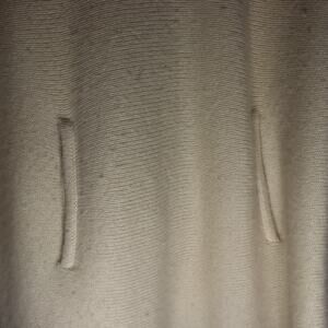 Luxurious 100% cashmere poncho-style sweater by Muse in a soft cream shade. Features a wide, cozy cowl neck, flowing draped sides, and two front slit pockets. Ultra-soft, warm, and easy to style over tees, blouses, or dresses. In good condition with light typical cashmere wear and a few small areas of minor fuzzing/pilling (shown), but overall presents beautifully.