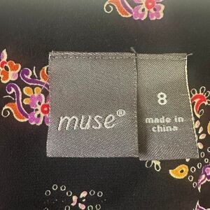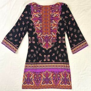 muse black orange and purple paisley gemstone v neck mini dress with flare sleeves, size 8