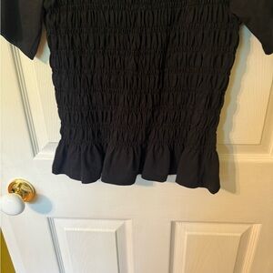 The Muse Black Short Sleeve Peplum Tee combines casual comfort with a touch of elegance. Crafted from a stretchy knit material, it features a fitted upper portion and a stylish peplum ruffle at the waist. Perfect for adding a feminine flair to your everyday look.