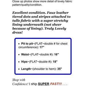 Excellent condition. Faux leather tiered dots and stripes attached to tulle fabric with a super stretchy lining underneath (not sheer because of lining). Truly Lovely dress!