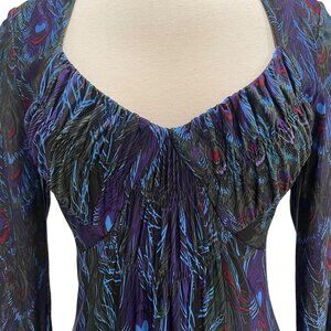Muse Womens Peacock Feather Print Dress Deep V-Neck Sz 6 Boho Chic Evening Wear