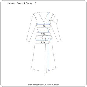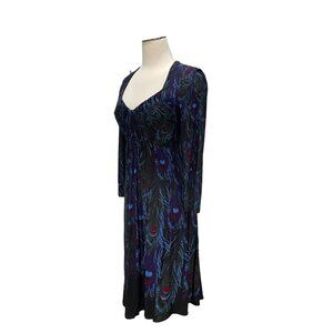 Muse, women's dress, peacock feather print, long sleeve, deep V-neck, multicolor, size 6, boho chic, evening wear, stylish, elegant, special occasions, eye-catching, comfortable, soft fabric