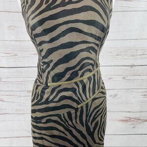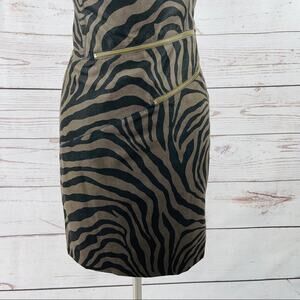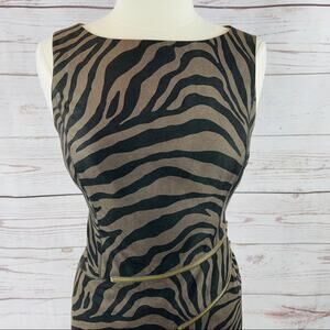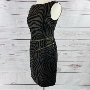 Muse animal print sheath dress with zipper accents on the front. Exposed rear zipper and kick pleat. ALL zippers work, the front zippers make a small pocket or pouch. The material is very stretchy. Size 8 black and brown