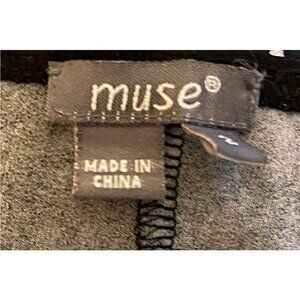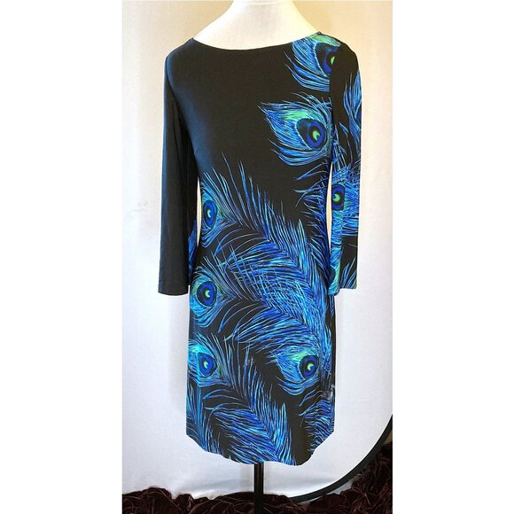 Muse black and peacock feather print shift dress with flared sleeves. 95% poly 5% spandex material is slinky and stretchy.
