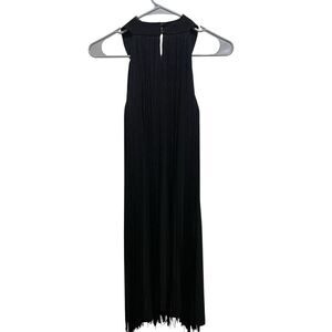 The Boston Proper Muse dress in size 4 is a sophisticated and stylish choice for a cocktail or party occasion. This sleeveless, above knee dress features a solid black color with fringe accents, adding a touch of edginess to the classic sheath style. The 2 button closure with keyhole detail adds a unique and chic element to the dress, making it a standout piece in any woman's wardrobe. The lining provides a comfortable fit and quality feel, making it a versatile and fashionable option for special events.