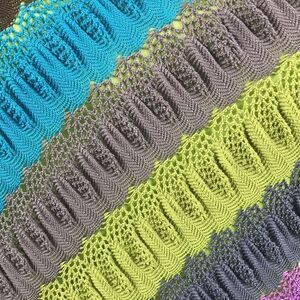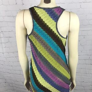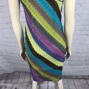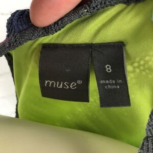 Beautifully knit / crocheted dress by Muse in bright colors makes this a unique item. Racerback neckline, lined in line green poly, with fine detailing makes this feel sporty yet dressy. Size 8