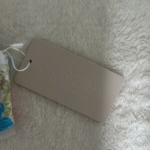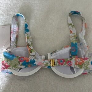 Stylish bikini top with vibrant floral design. Features blue and green accents. Ideal for beach outings.