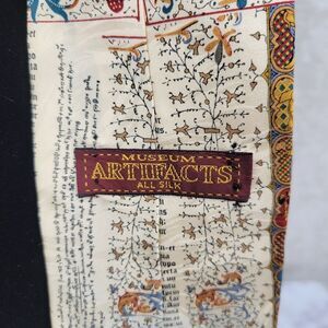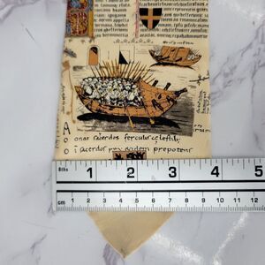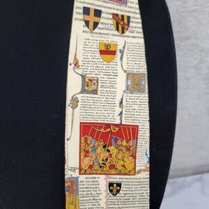 This tie looks to be scenes of Medieval times. There are crests, knights, old wooden ships, battle scenes and writings. Tie is in parchment color with deep reds, blues, browns and black. Perfect for the historian!