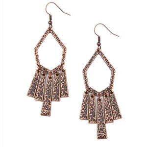 Hammered in antiqued detail, flared rectangular frames swing from the bottom of a geometric copper frame for a rustic flair. Earring attaches to a standard fishhook fitting.
