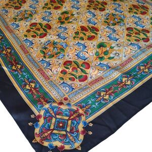 Beautiful 100% silk square scarf made exclusively for the Museum of Fine Arts, Boston. Features a striking multicolor geometric and floral motif in rich shades of red, blue, green, yellow, and white with an elegant navy border. Luxurious silk fabric drapes beautifully, perfect for styling as a neck scarf, hair accessory, handbag accent, or display piece. Pre-owned in like new condition with no visible flaws. A collectible accessory for lovers of art, fashion, and culture.