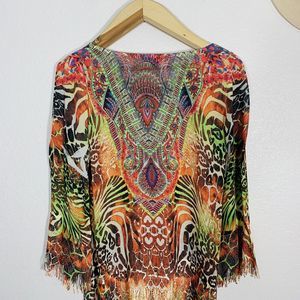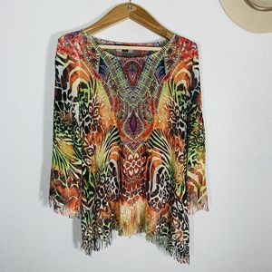 Mushka Sienna Rose Inc. Colorful Boho Hippy Blouse Size Medium Womens, in newish condition! The sleeves and the bottom hem are tasseled fringes. Size medium Pit to pit 20-20.5 Length: 27.5-29 approx Bin # 8