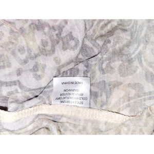 This pre-owned Anushka by Sienna Rose women's long-sleeve top features a cream base with a vibrant floral print in blue, orange, and green hues. It has a V-neckline with a twisted front detail and 3/4 length sleeves. The back has a round neck and continues the floral pattern over a subtle background design. Made in China, the fabric composition is 65% Polyester and 35% Rayon, with care instructions for cold wash and flat dry.