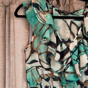Mushka by Sienna Rose Inc Turquoise Abstract Pattern Ruffled Blouse Size Medium. Elastic under bust line. V neck accented by ruffles. Material as shown in photos.