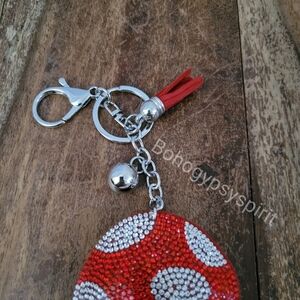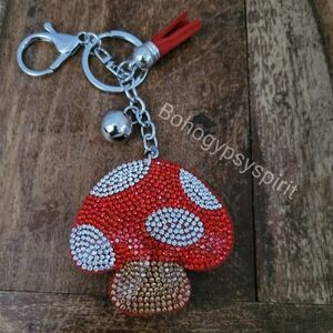 Tag: Mushroom, Crystal, Rhinestone, Red, White, Brown, Tan, Luxury, Keychain, Backpack, Bag Charm, Diaper Bag, Purse Charm, Accessories, Tassel, Keyfob, Keyring, Bling, Wristlet, Bohemian, Boho, Gypsy, Hippie, Coachella.