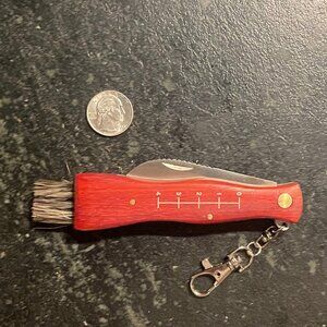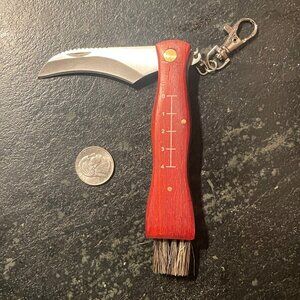 This mushroom foraging package is new, never used. The bag and knife were opened up for photos to supplement the manufacturer's stock photos. Attractive and lightweight. The mesh bag design allows mushroom spores to escape after harvesting to support ongoing propagation. Inside the bag are convenient pockets for a phone, knife, notepad, camera, and/or whatever else. The switchblade knife is specifically designed for mushrooming with a sharp curved blade at one end, a serrated edge, and a brush at the other end to help sweep forest material off at the time of harvest. Built into the handle is an attractive guide to help measure the size of each specimen. The knife also comes with a convenient lobster claw clasp.